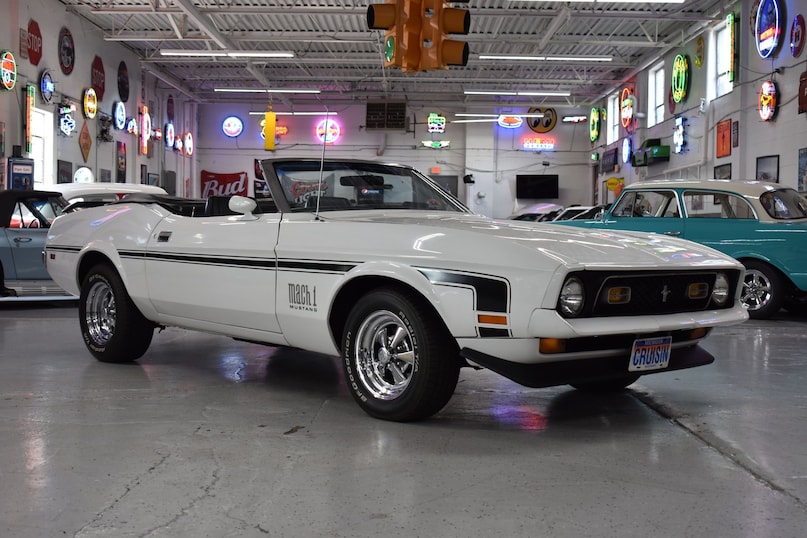 The Mach 1 package included a front spoiler, rear ducktail spoiler, black hood scoops, NASA style hood pins and dual exhaust, further enhancing the car's roaring sound and aggressive look.